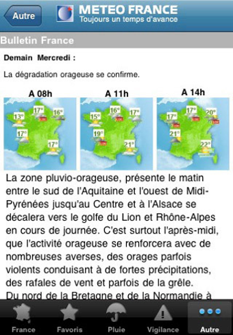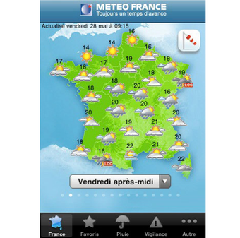 Météo-France permet de garder une ou plusieurs villes en favoris pour voir la température, le temps et le vent à prévoir. Les 36000 communes de France sont répertoriées. L'application permet aussi d'avoir un oeil sur la pluviométrie dans votre région.